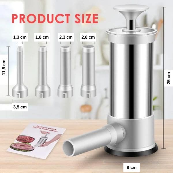Αυτός ο γεμιστήρας λουκάνικων περιλαμβάνει τέσσερα ακροφύσια PP με διαφορετικές διαμέτρους: 1,3 εκ. 1,8cm, 2,3cm και 2,8cm.